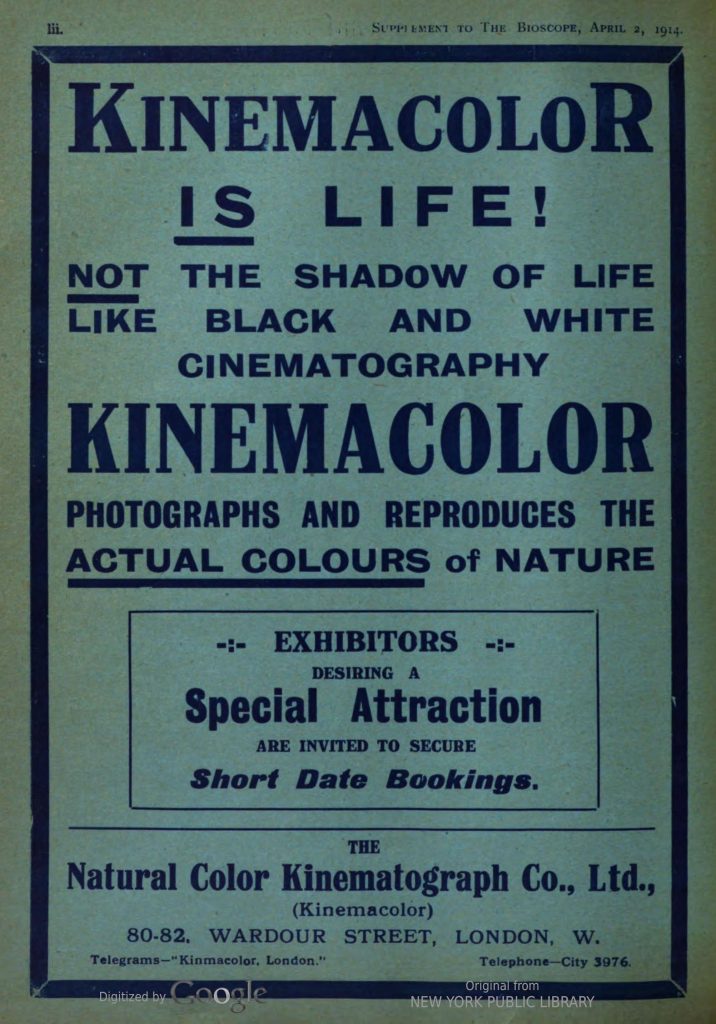 The US was quick to embrace the early attempts at natural color. All the successful early color processes utilized a limited color palette derived from the combination of red and green, red/orange and blue/green, or some variation. Think of the color modes in computer displays and printing: RGB (Red, Green, and Blue) and CMYK (Cyan, Magenta, Yellow, and Black), these are able to reproduce the full spectrum. The problem with color for cinema was capturing the necessary color information simultaneously, and finding a way to project it on screen. The initial comprimise was sacrificing the yellow/blue end of the spectrum, and capturing red and green records sequentially, one after the other. Two early processes successful with this arrangement were Kinemacolor and Prizma. Both shot with panchromatic black and white film exposed through a rotating filter in front of the camera lens, at 32 fps, double the normal shooting speed of 16 fps.