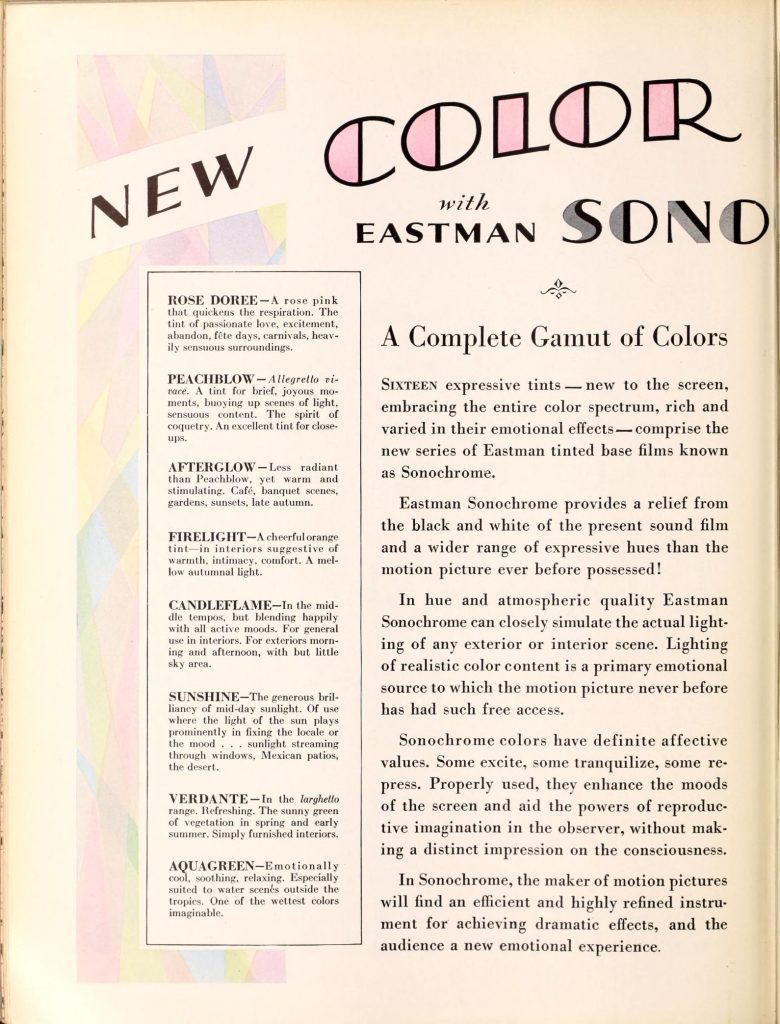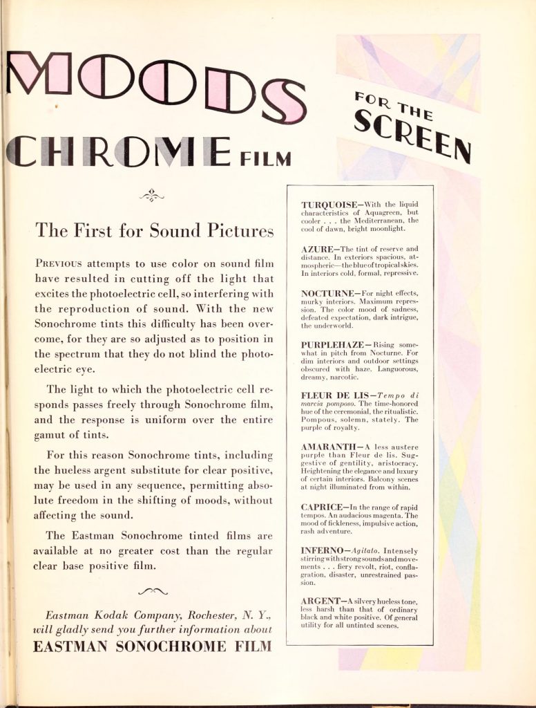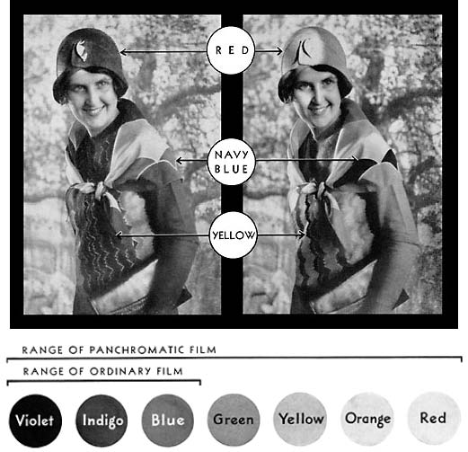 One of the most fundamental differences between the imagery of most films from the silent era and the sound era is a matter of film stock. Most photographic film produced for stills or motion pictures until the early 1930s was what is called orthochromatic. This means the film is only sensitive to a limited range of the spectrum of light: ultraviolet, blue, and green (which was an improvement over the earliest photographic emulsions only sensitive to ultraviolet and blue).