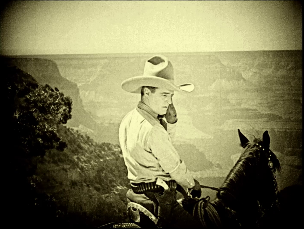 Three frames from Sky High (1922) with Tom Mix, illustrating the atmospheric haze, light skies, and tonality typical of orthochromatic film shot outdoors. (sourced from the Undercrank productions Blu-Ray)