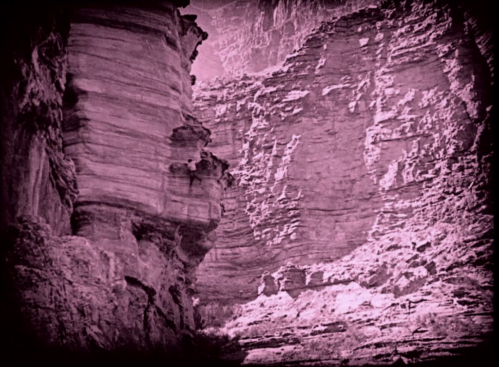 But more common than color used to render scenes realistically, was color used to suggest atmosphere or mood. Tinting and toning are two related but different processes which were used in this way. Tinting gives an overall color to the image by immersing the film in a dye bath, staining the gelatin emulsion on the film base. Toning is a chemical process which bleaches out the silver halide image from the emulsion, replacing it with a colored metallic compound. The resulting image differs from that of a dye tint in that the whites remain white, and the dark areas of the image are colored. Tinting and toning could also be combined for dramatic effects. Blue tone with a pink tint was often used to suggest early morning or early evening. In the last sample below, blue tone with a yellow tint is used to suggest the glow and warmth of electric lights at night. Elaborate tinting and toning peaked in US films in the mid 1910s thru the early 20s. By the late 20s, you were likely to have an occasional scene employing a tint, with the main body of the film printed in B&W. (All samples from Timeline of Historical Film Colors.)