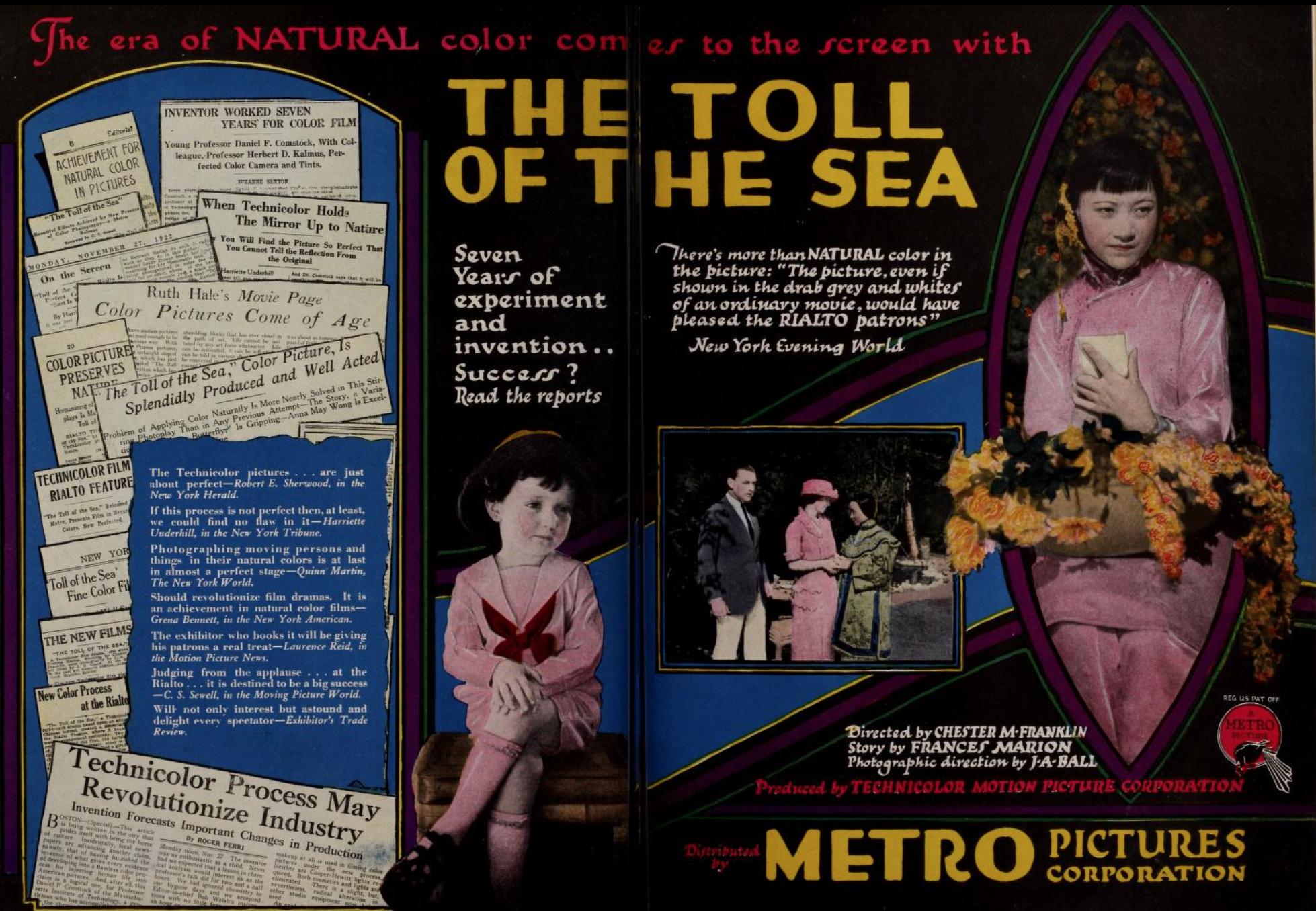 Technicolor, a corporate name you are likely familiar with (perhaps used as an adjective implying vividness), incorporated in 1915, proved the commercial viability of their refined process in 1922 with their feature production The Toll of the Sea, an adaptation of Madame Butterfly, with the action moved to China instead of Japan. In the technicolor II process, the image passed through the lens, into a beam splitter, through red and green filters, registering 2 frames at a time on the negative. (Images from The Dawn of Technicolor by David Pierce and James Layton.) Prints were made by printing the red and green records separately onto half thickness films which were then toned their relative colors, and cemented together. By 1926 Technicolor introduced their dye imbibition printing technique, which worked similar to lithography, which applied layers of dye from printing matrices for each color record, forming the image. This printing process, with refinements would be used by Technicolor until the late 1970s. Technicolor had more or less won out over the other processes by the mid 20s, and from 1923 onward in Hollywood, would be used for select scenes in prestige productions, within otherwise monochrome films. Entire features shot in color would be sporadic until the end of the 1920s.